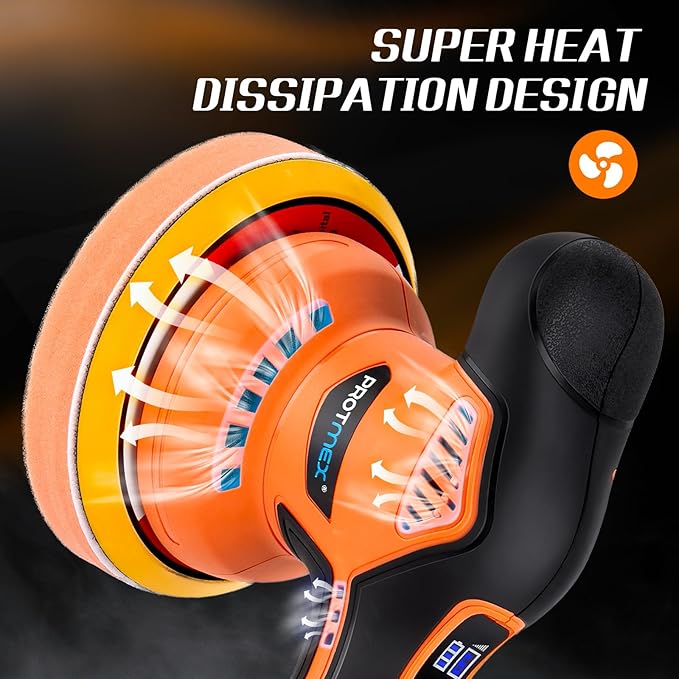 (2 BATTERIES FOR 100 MINS USE】 Protmex car buffers and polishers kit is equippedwith 2pcs upgraded 21V, 2000mAh batteries. The battery with large capacity and smallvolume. lt is always best to have a fully charged backup battery available to ensure thecontinuity of using the buffing machine. *Please fully charge before using it*【CORDLESS & LIGHTWElGHT】Compared to traditional orbital buffers, our car bufferpolisher has improved user experience with cordless and lightweight features. Protmexcordless polisher is only 3.3 lb including battery, instead of carrying heavy wiresaround. Protmex cordless buffer helps you get rid of the annoying cord. No more cordsgetting caught on a tire, no more dragging the mud all over the car.
